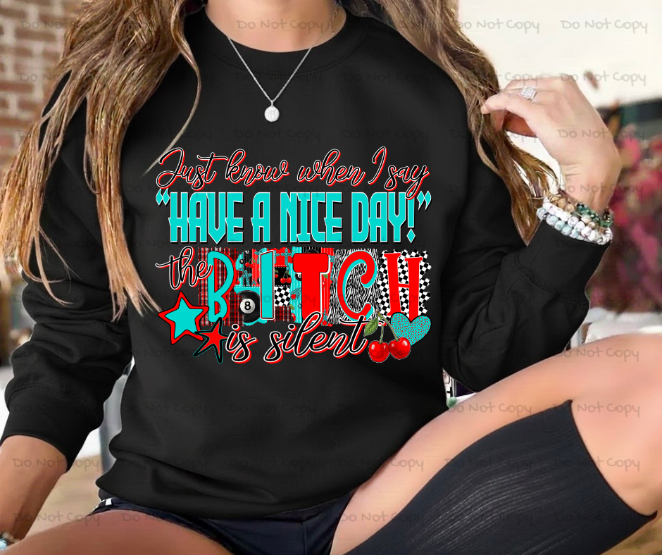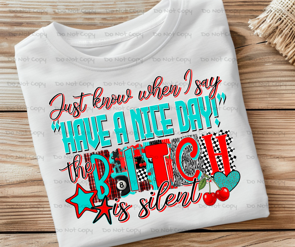 When I say Have A Nice Day The Bitch Is Silent-Snarky DTF Transfer Print(Only) Ready To Press